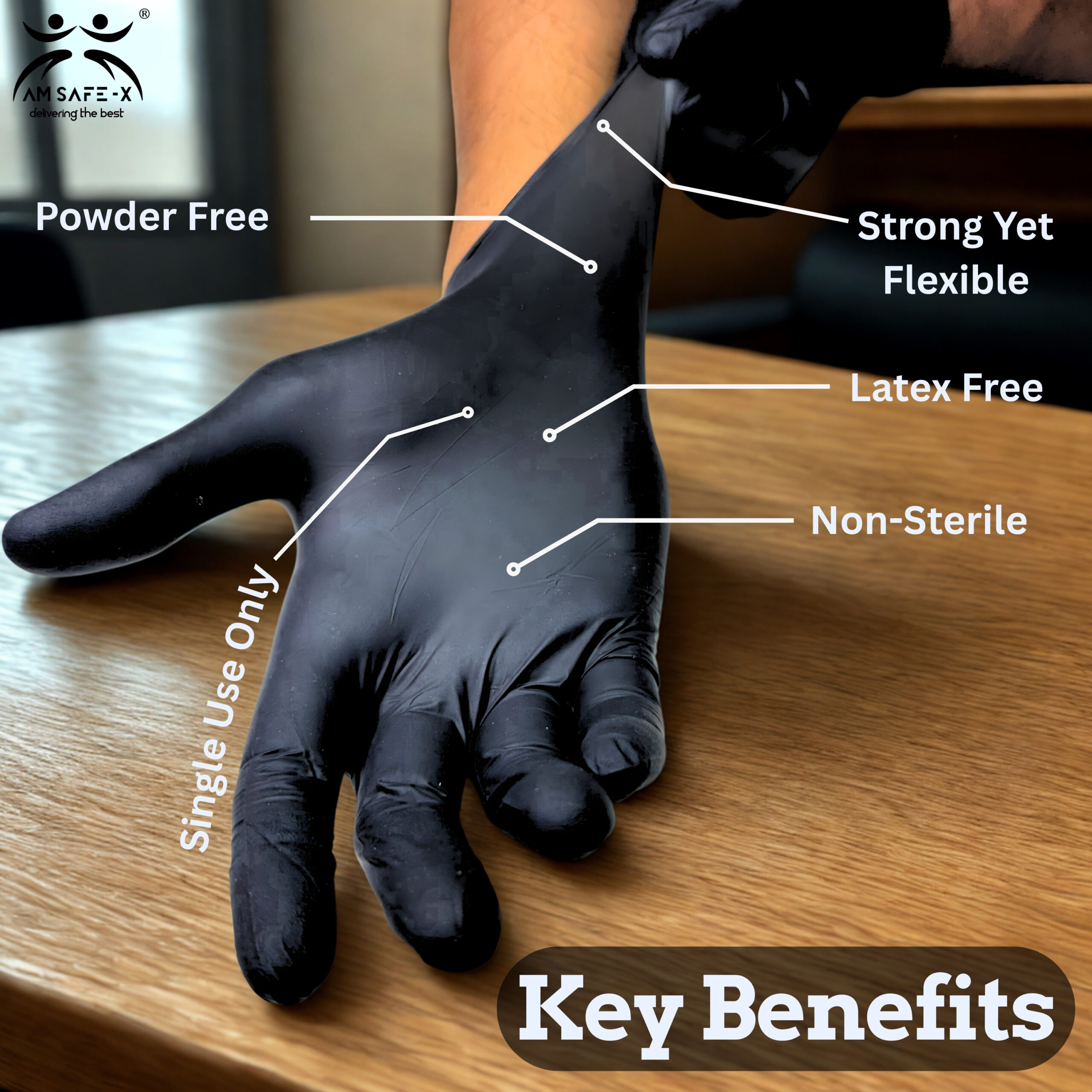 AM SAFE-X Black Nitrile Gloves are designed for superior durability, protection, and professional appearance across industrial and household applications. Made from premium-grade nitrile, these disposable gloves are latex-free and powder-free, making them suitable for sensitive skin while ensuring clean, residue-free handling.