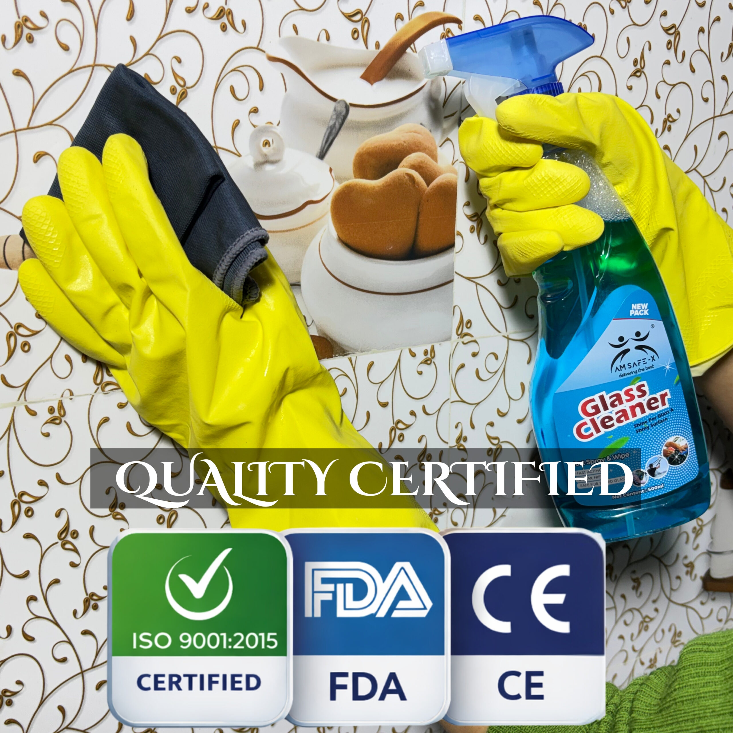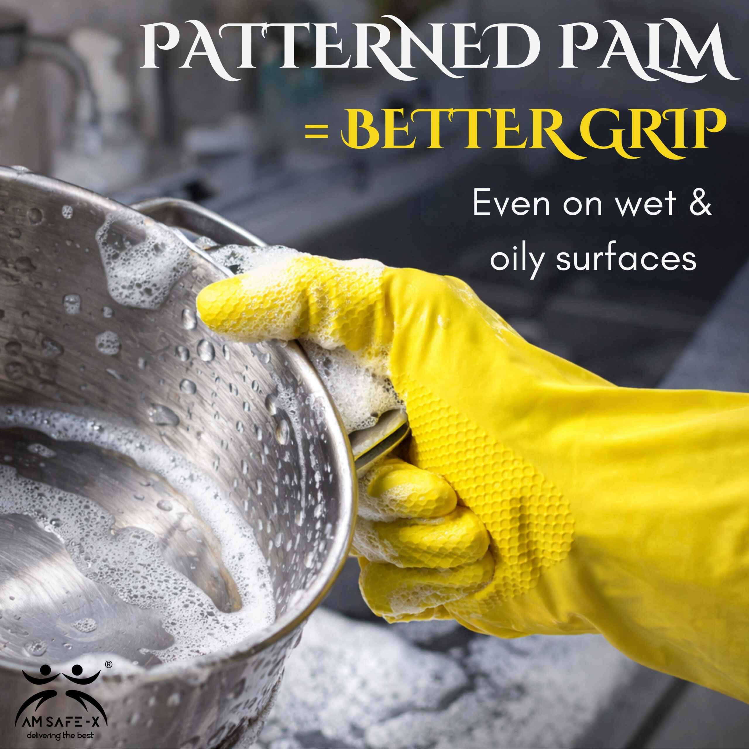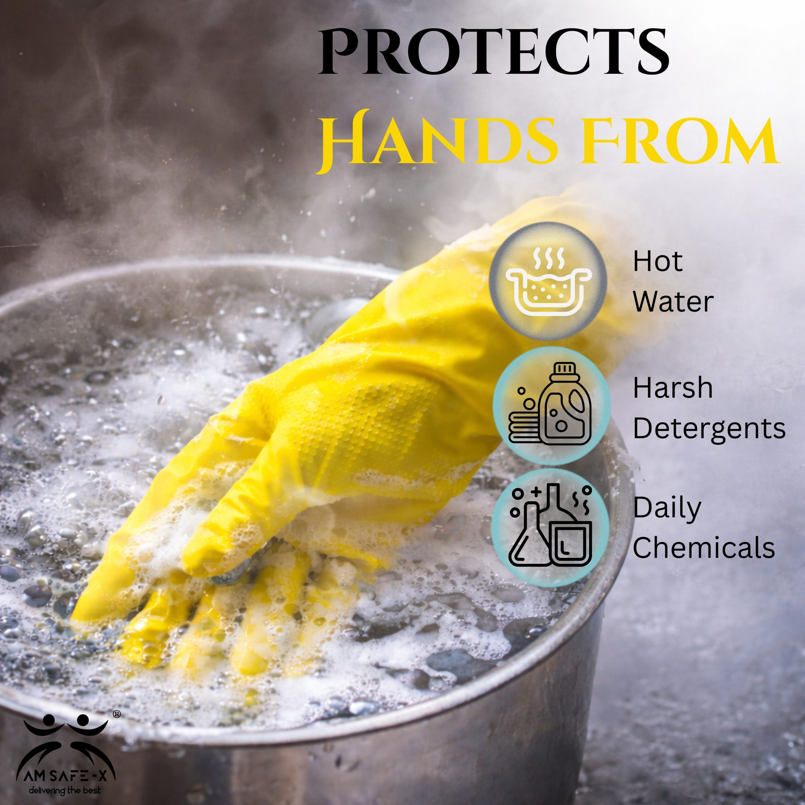 • AM SAFE-X Heavy-Duty Household Rubber Gloves are designed for maximum durability and protection in everyday tasks. Made from high-quality, thick rubber, these medium-size gloves (60 grams per pair) offer superior resistance to punctures, abrasions, and household chemicals. Whether you’re washing dishes, scrubbing toilets, cleaning the kitchen, painting, gardening, or handling pets, these multi-purpose gloves ensure your hands stay safe, dry, and comfortable. The anti-slip texture enhances grip, while the soft inner lining provides all-day comfort.