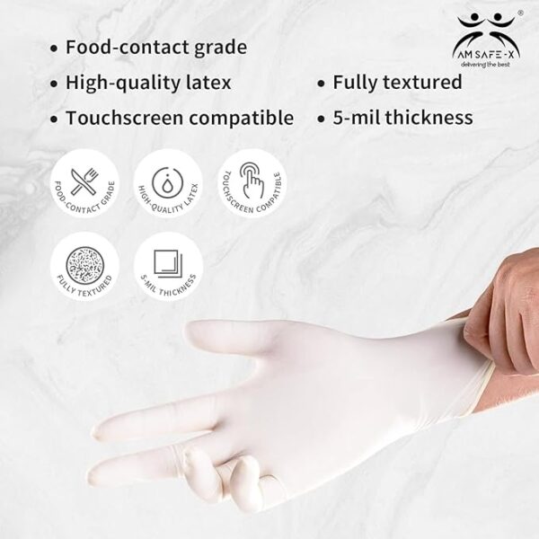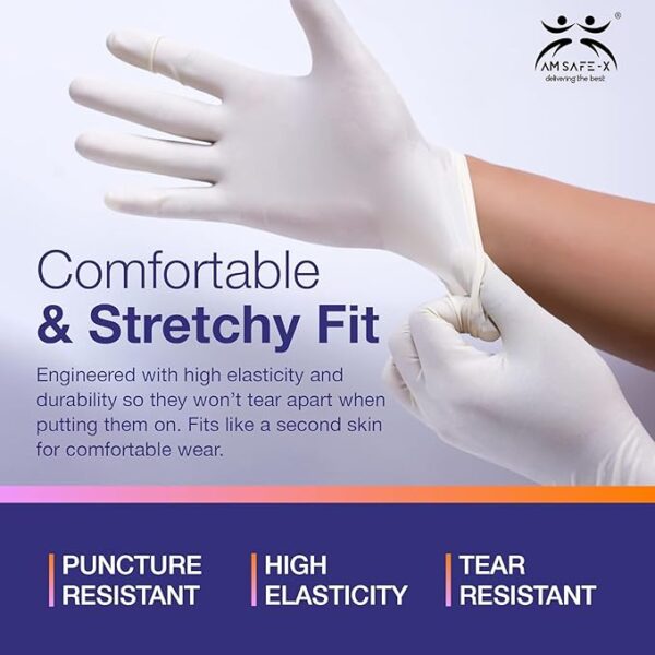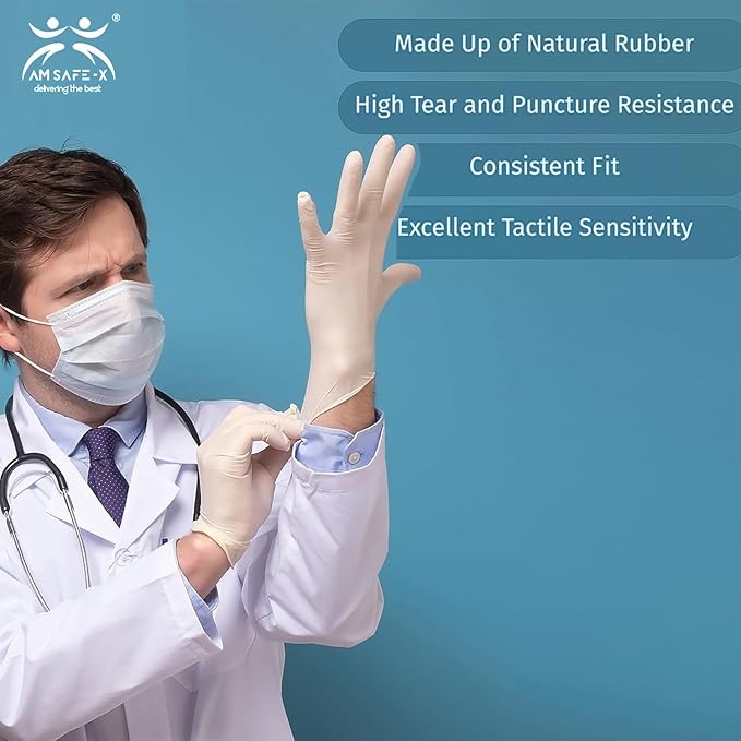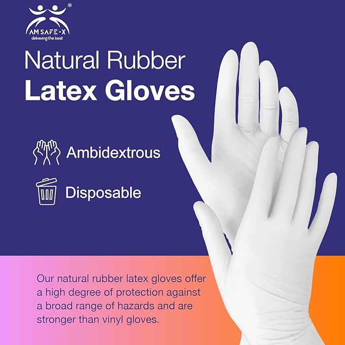 AM SAFE-X Latex Gloves are designed for superior protection and comfort across multiple uses. These white powdered latex gloves are CE-approved, ensuring reliable quality for food handling, medical examination, cleaning, and general-purpose applications. The textured grip and snug fit offer excellent tactile sensitivity and control. Perfect for healthcare professionals, home users, and commercial setups, these gloves provide hygiene and safety in every task.